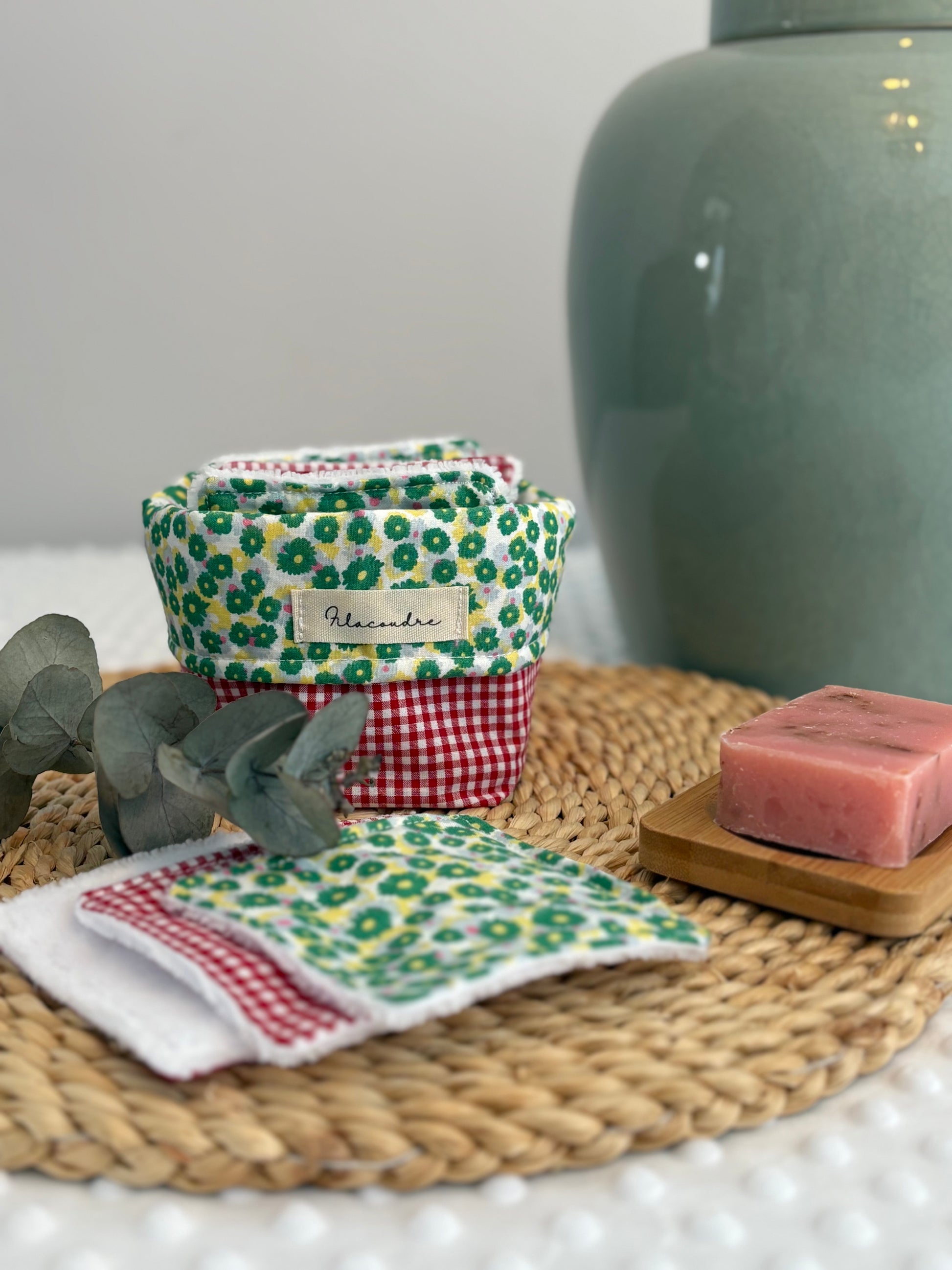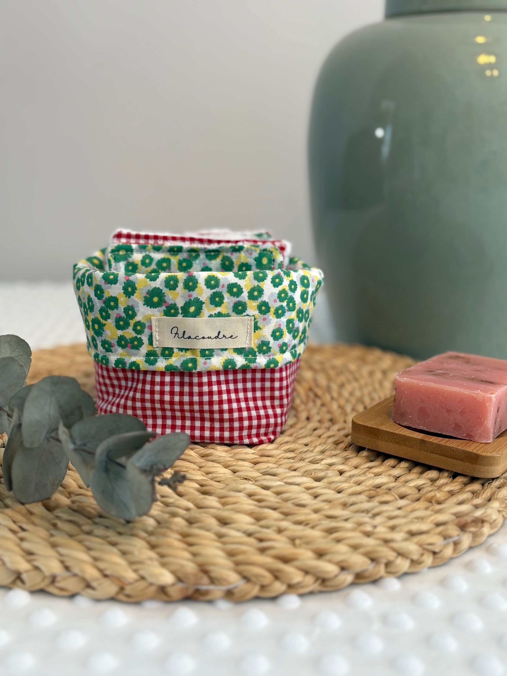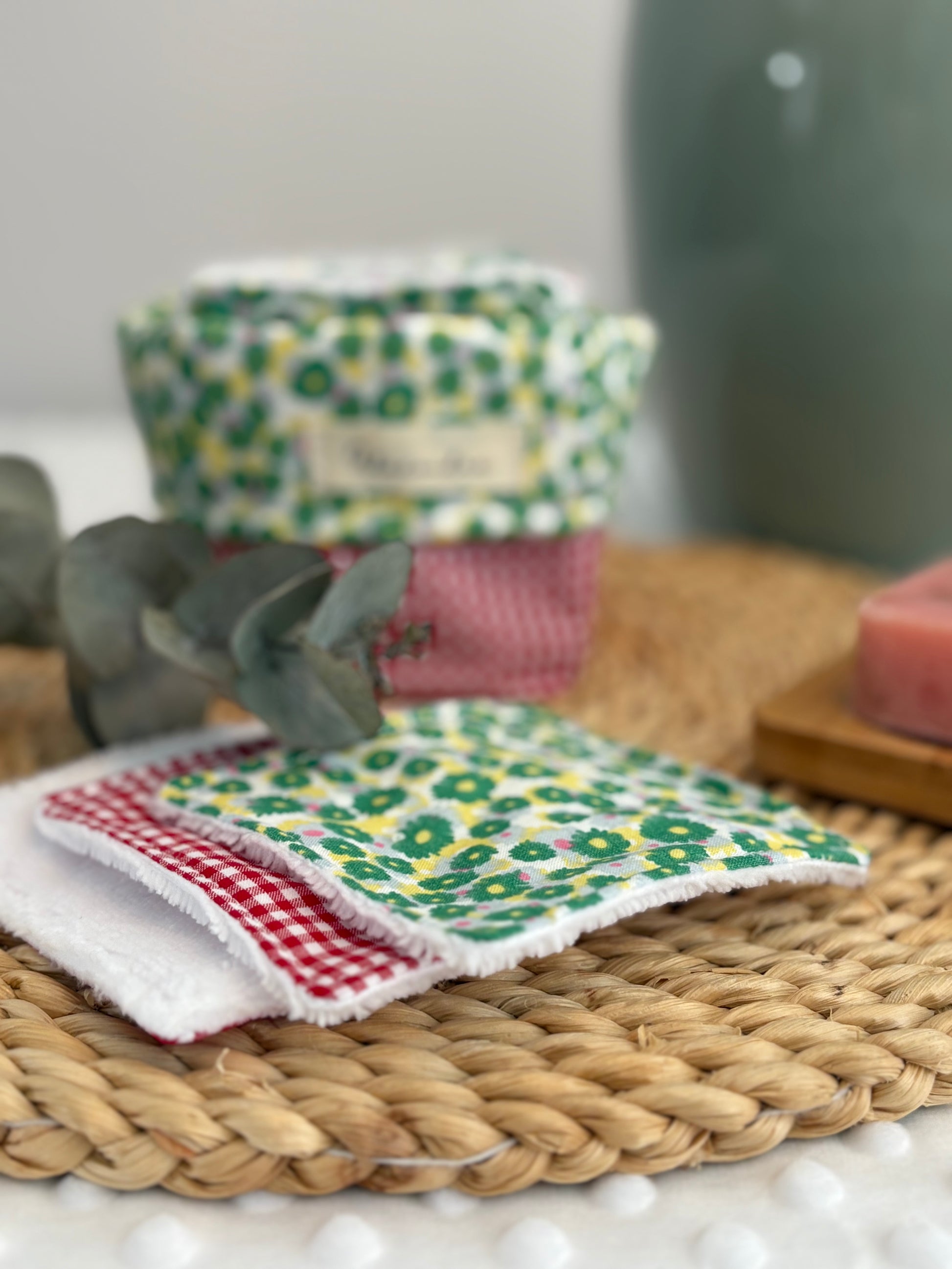 Práctica, sostenible y bonita 💚 Esta cesta de tela hecha a mano incluye 7 algodones reutilizables de 10x10 cm, confeccionados en algodón y rizo de bambú, un material suave e ideal para pieles sensibles.