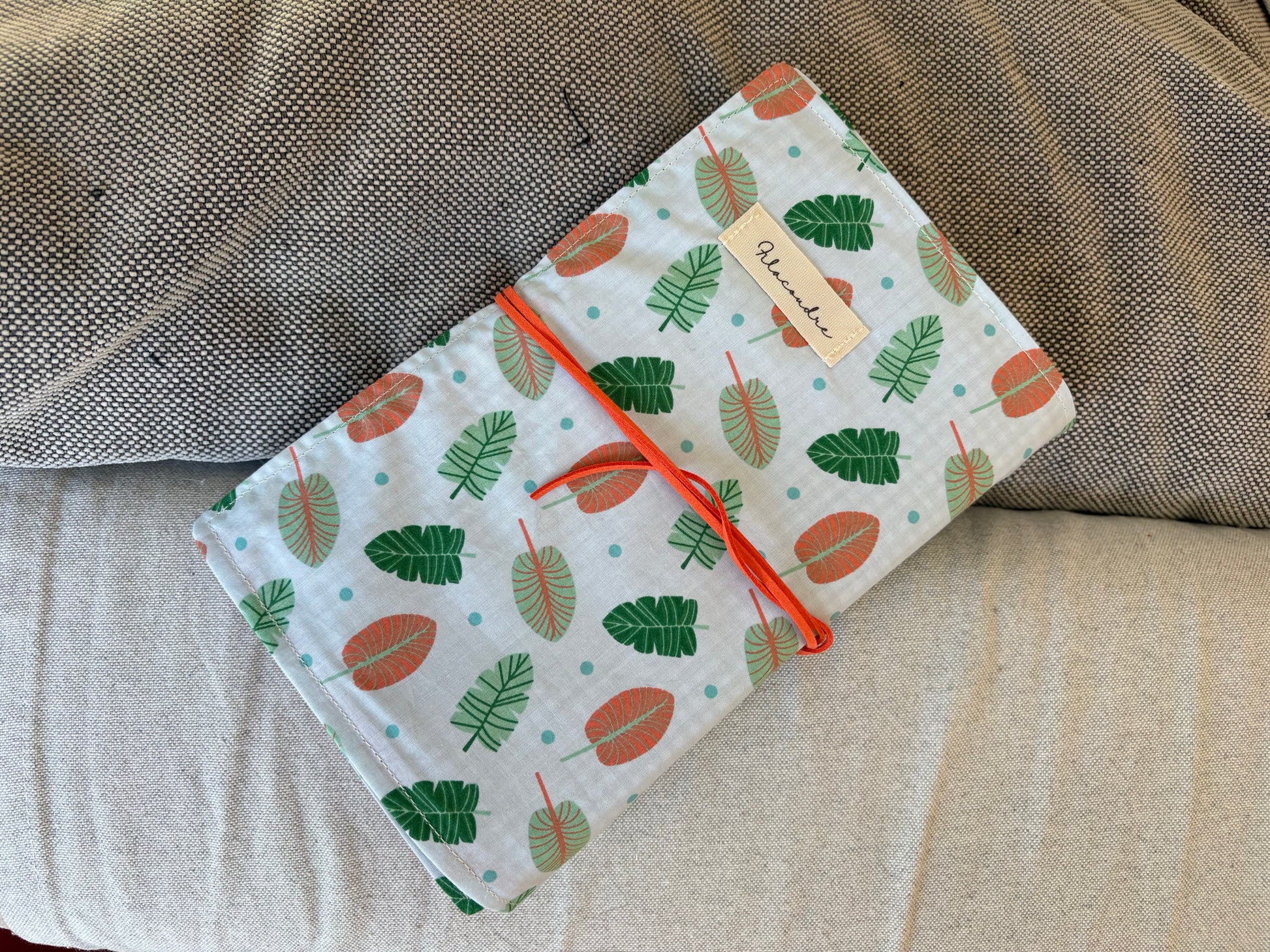 Confeccionada con algodón de estampado de hojas , su diseño combina funcionalidad y ternura. El toque especial: un cordón de pana que mantiene el libro bien cerrado y le da un aire rústico y elegante.