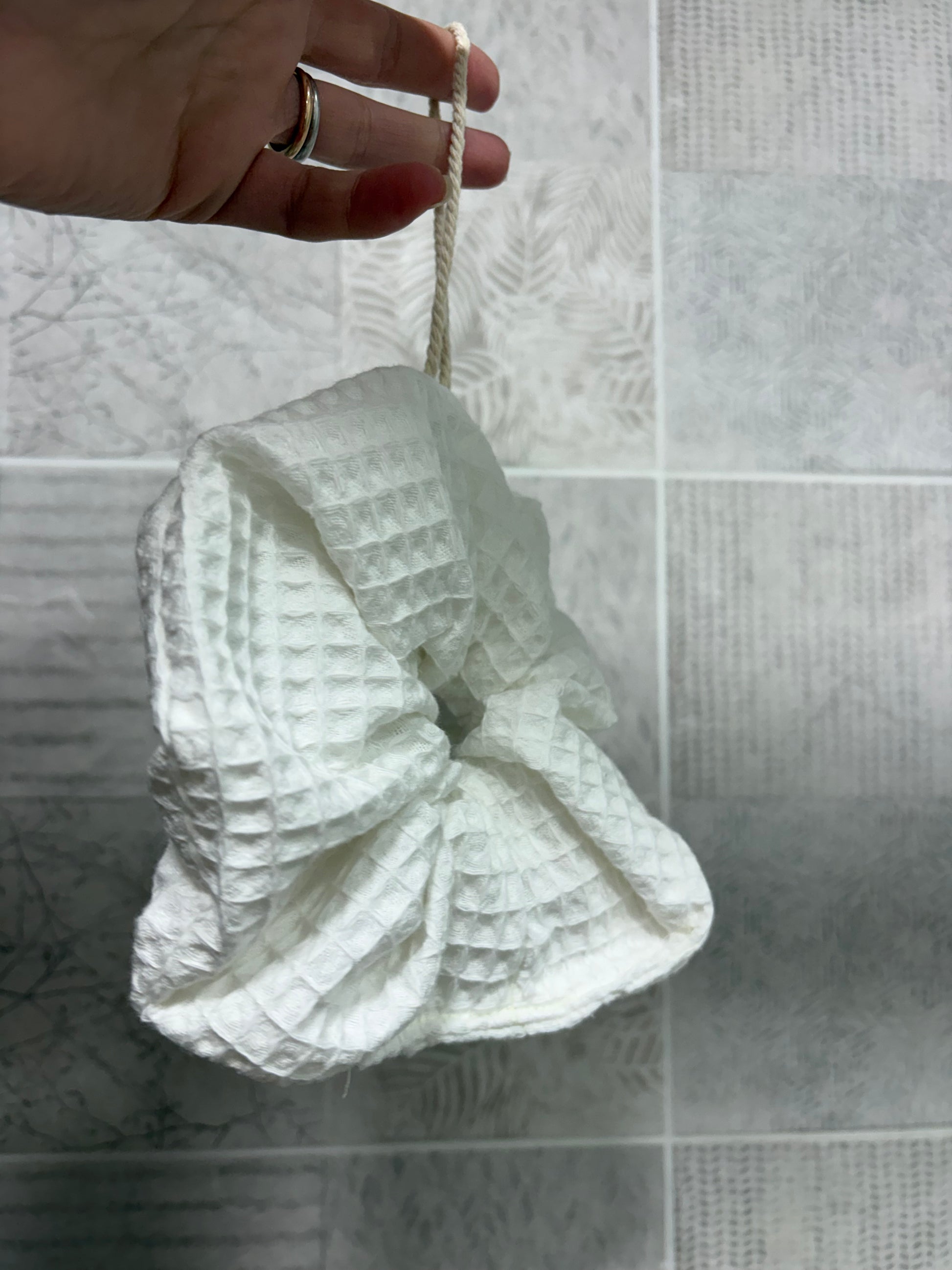 Hecha a mano con algodón , ideal para pieles sensibles por su delicadeza y capacidad de absorción. Una alternativa suave y sostenible a las esponjas de plástico.