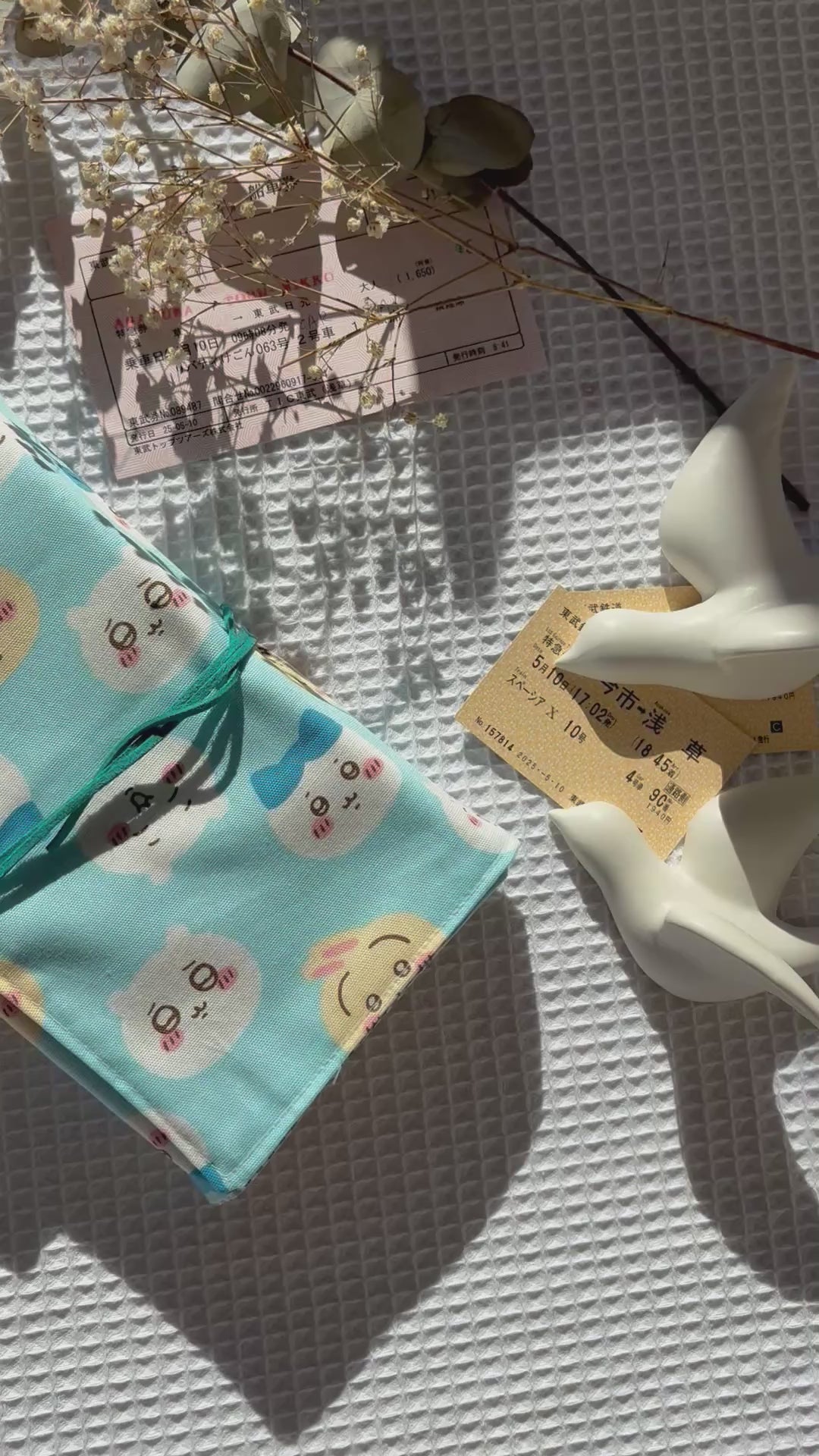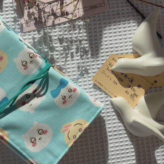 Confeccionada con algodón de estampado de Chiikawa azul, su diseño combina funcionalidad y ternura. El toque especial: un cordón que mantiene el libro bien cerrado y le da un aire rústico y elegante.