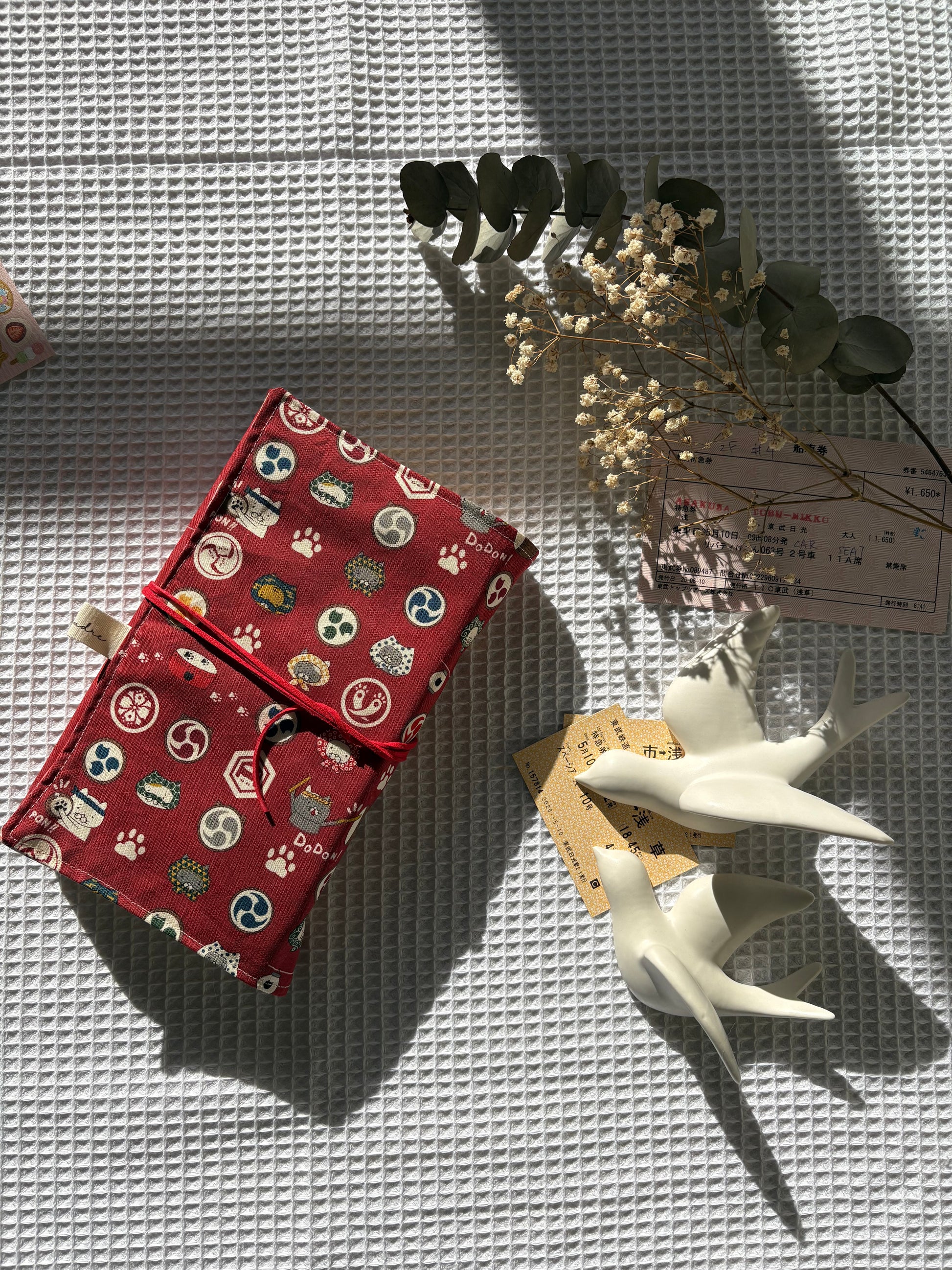 Confeccionada con algodón de estampado de Festival Cat red, su diseño combina funcionalidad y ternura. El toque especial: un cordón que mantiene el libro bien cerrado y le da un aire rústico y elegante.