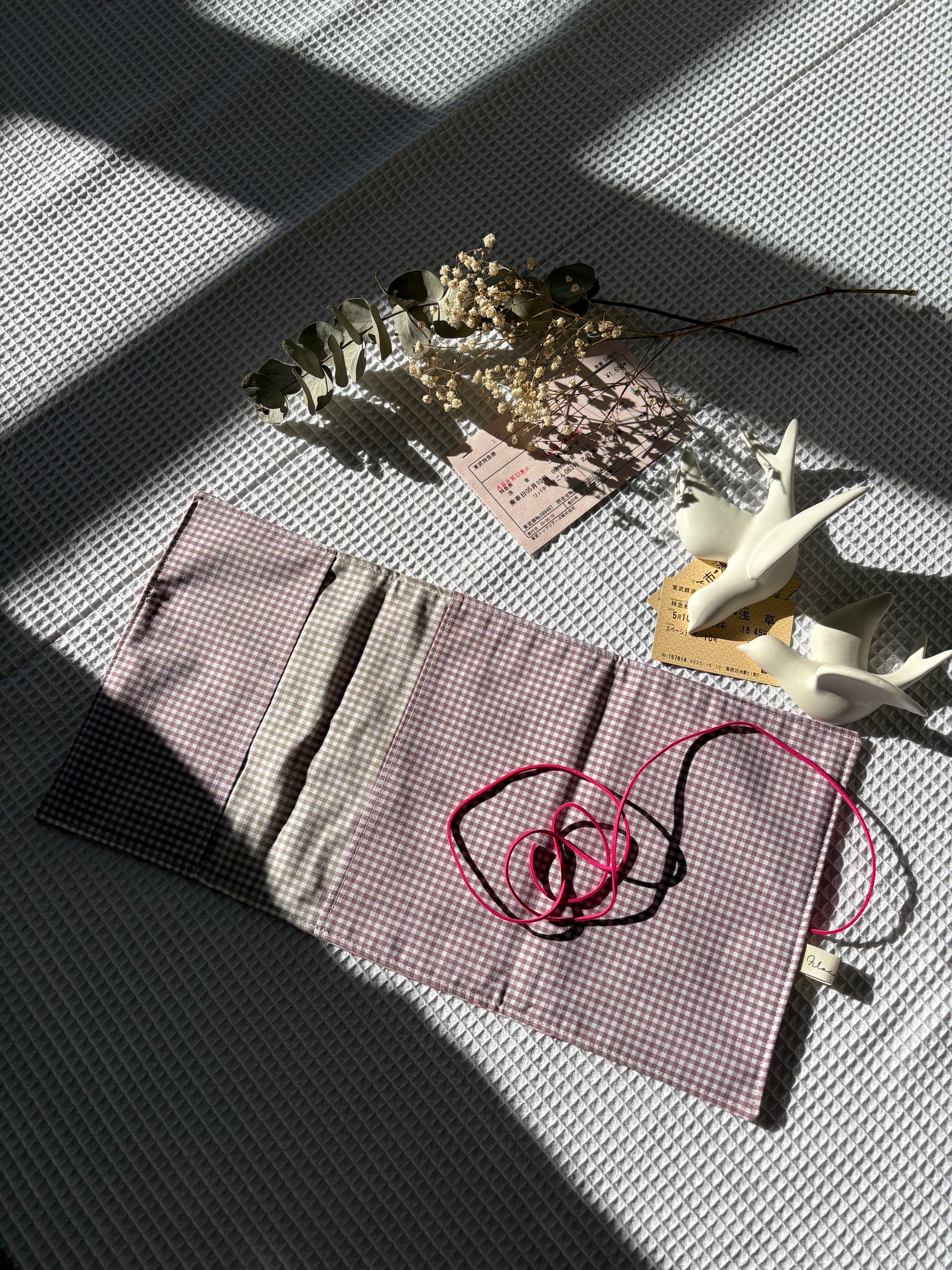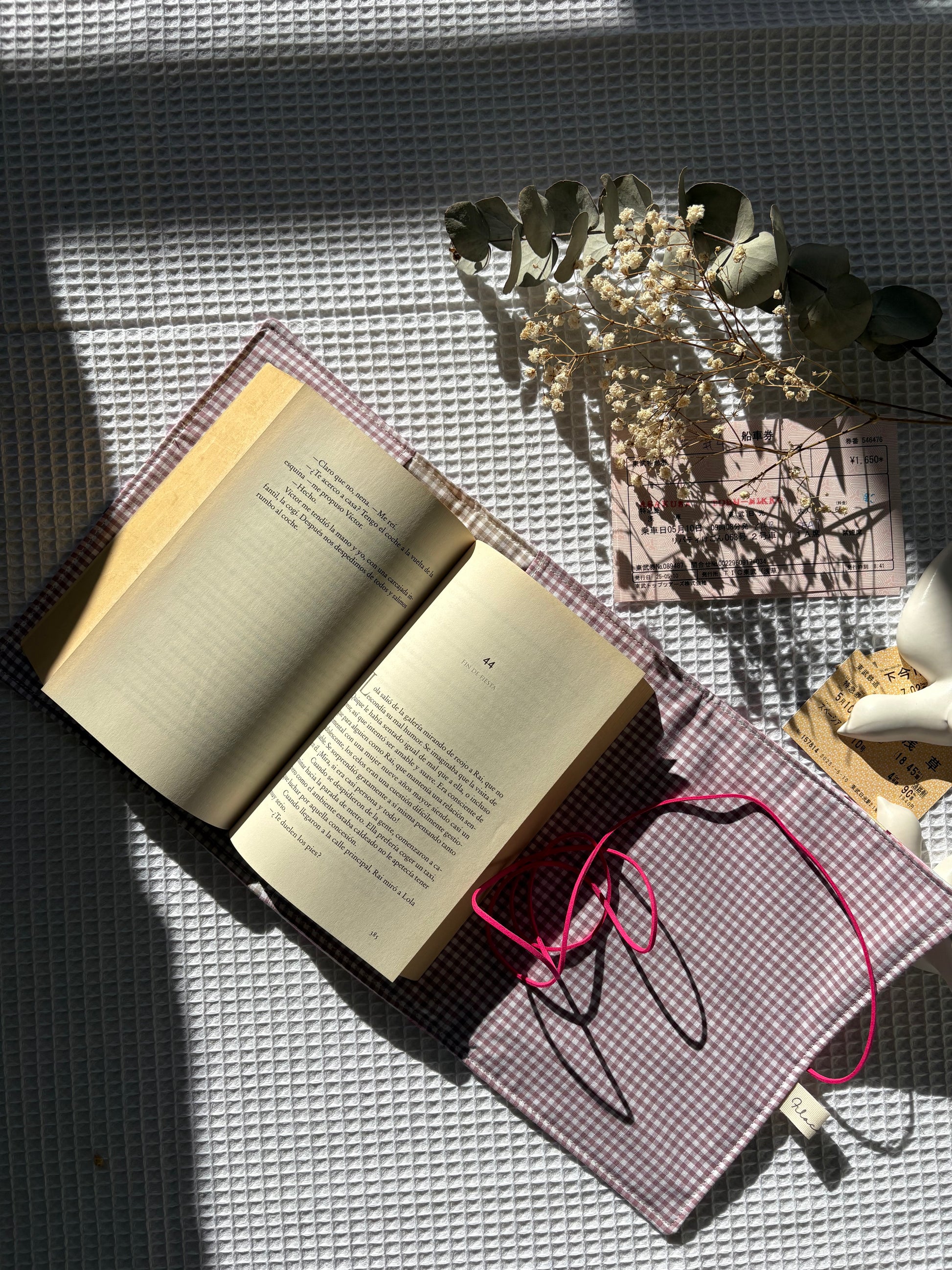 Confeccionada con algodón de estampado de Sanrio helados rosa, su diseño combina funcionalidad y ternura. El toque especial: un cordón que mantiene el libro bien cerrado y le da un aire rústico y elegante.